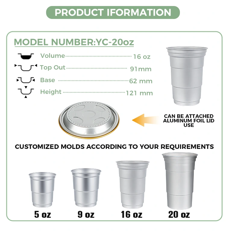 Yunchu एक अग्रणी चीन 16oz डिस्पोजेबल कस्टम एल्युमिनियम पन्नी पेय कप निर्माता हो। यो 16oz डिस्पोजेबल कस्टम एल्युमिनियम पन्नी पेय कप कफी र बियर जस्ता मानक पेय पदार्थहरूको लागि उपयुक्त 460-मिलिलिटर एल्युमिनियम पन्नी कप हो। यसले एक मानकीकृत डिजाइन सुविधा दिन्छ र मुख्यतया व्यावसायिक प्रयोगकर्ताहरू जस्तै कफी पसलहरू र बारम्बार अनुकूलन आवश्यकताहरूसँग शिल्प बारहरूमा लक्षित छ। कुशल ताप प्रवाह र आधारभूत सील प्रदर्शन प्रदान गर्दा, यो 16oz डिस्पोजेबल कस्टम रिसाइकल योग्य एल्युमिनियम पन्नी पेय कपले द्रुत र लचिलो ब्रान्ड भिजुअल अनुकूलन सेवाहरूमा पनि बढी जोड दिन्छ।