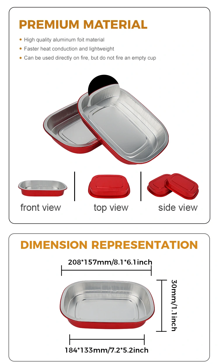 Yunchu एक पेशेवर निर्माता र चीन मा एल्युमिनियम पन्नी कन्टेनर को आपूर्तिकर्ता हो। डिस्पोजेबल रातो लन्च बक्स स्क्वायर एल्युमिनियम पन्नी कन्टेनरहरू हामीले तपाईका लागि 208*157 मिलिमिटर (8.1*6.1 इन्च) को व्यास छ। तल्लो व्यास 184*133 (7.2*5.2 इन्च), उचाई 30 (1.1 इन्च), र क्षमता लगभग 680 मिलिलिटर (23.9OZ) हो। यसले फूड-ग्रेड 8011 फूड-ग्रेड एल्युमिनियम पन्नी गाढा आधार सामग्री अपनाउछ, जसले दुवै कठोरता र लोड-असर क्षमतालाई ध्यानमा राख्छ, विकृत वा चुहावट गर्न सजिलो छैन, र सीधा खानालाई समर्थन गर्न सक्छ। यो -20 ℃ देखि 220 ℃ को एक अल्ट्रा चौडा तापमान दायरा संग उपयुक्त छ। कुनै demolding आवश्यक छैन। यसलाई प्रयोगको लागि सिधै ओभन, एयर फ्राइर वा स्टीमरमा राख्न सकिन्छ, र संरक्षणको लागि फ्रिजमा पनि राख्न सकिन्छ। यसले "बेकिंग - भण्डारण - खपत - डिस्पोजल" को एक-स्टप सुविधाजनक अनुभव प्रदान गर्दछ। एल्युमिनियम पन्नीको मुख्य फाइदा यसको उच्च थर्मल चालकता हो। सुनको कोटिंगले तातो जम्मा गर्न मद्दत गर्दछ, सुनिश्चित गर्दछ कि खाना समान रूपमा र छिट्टै तताइएको छ।