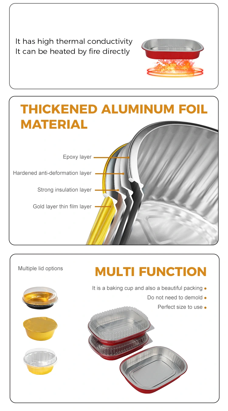 बेकरी र पश्चिमी रेस्टुरेन्टहरूले डिस्पोजेबल रातो लंच बक्स स्क्वायर एल्युमिनियम पन्नी कन्टेनरहरू ग्रिल गरिएको डुरियन, बेक्ड मीठो आलु र ग्रिल गरिएको मासु प्लेटहरू बेच्न प्रयोग गर्न सक्छन्। सुनौलो बनावटले उत्पादनको ग्रेड बढाउँछ। ग्राहकहरूले अतिरिक्त प्लेटिङ बिना तिनीहरूलाई तताउन र सिधै खान सक्छन्। टेकआउट फूड व्यापारीहरूले यसलाई बेक्ड राइस, ग्रिल गरिएको चिकन पखेटा र अन्य परिकारहरू वितरण गर्न प्रयोग गर्छन्। एल्युमिनियम पन्नी तापक्रम र ताजापनमा ताला लगाउँछ। डिलीवरीको एक घण्टा पछि पनि खाना तातो रहन्छ र सूप चुहिदैन।