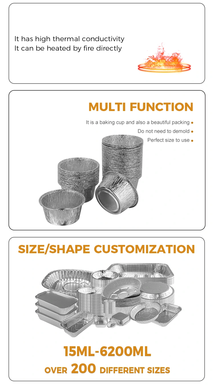 सुविधाहरू: स्वस्थ र वातावरण मैत्री, कुनै सरसफाइ आवश्यक छैन, विभिन्न घरेलु र बेक्ड व्यंजनहरू बनाउनको लागि उपयुक्त। यो परिवार र बेकरीहरूको लागि उत्तम विकल्प हो। एल्युमिनियम पन्नी सामग्री सुरक्षित र स्वच्छ छ, कुनै सफाई आवश्यक पर्दैन, र यसलाई स्वादिष्ट खाना बनाउनको लागि सुविधाजनक बनाउँदै खुला आगोमा पकाउन सकिन्छ।