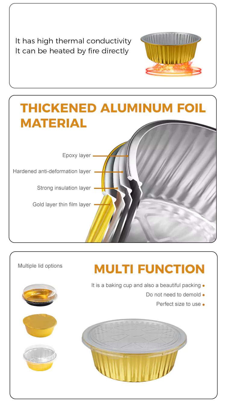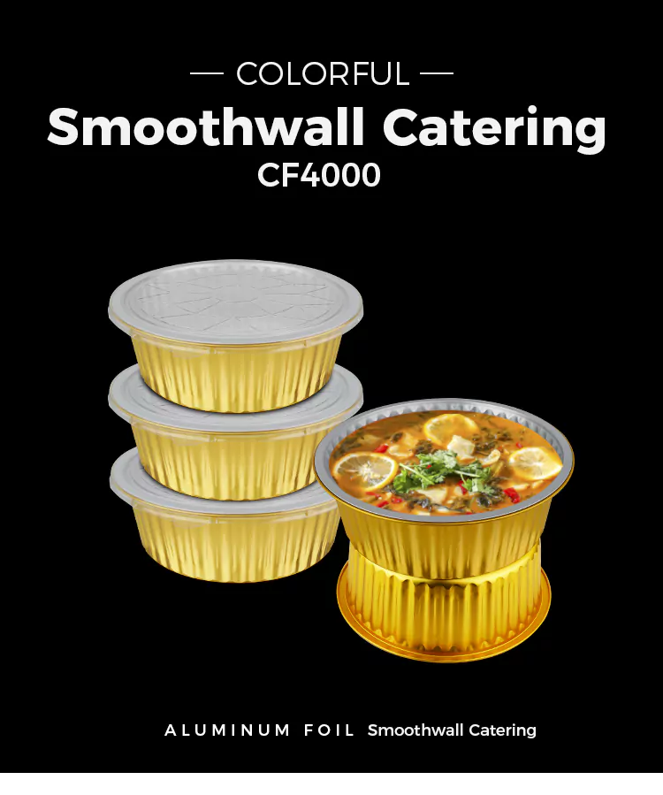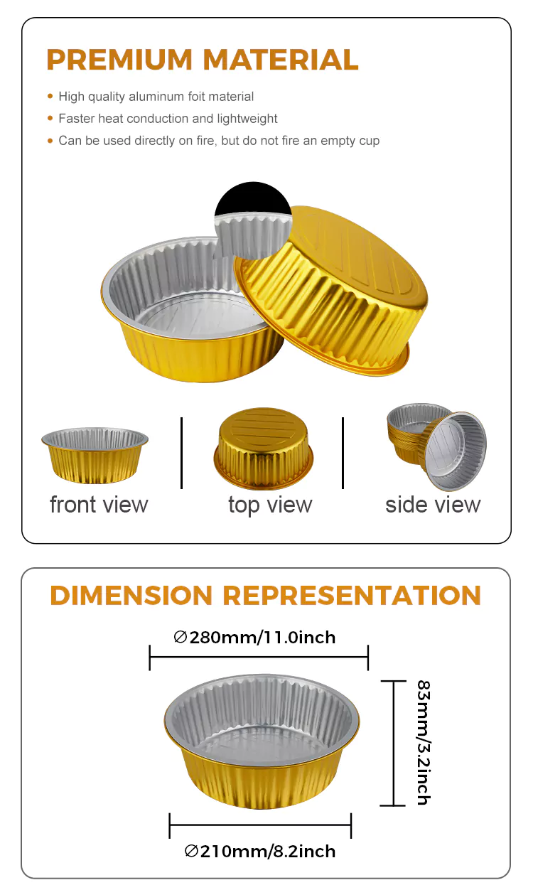 हट ट्यागहरू: डिस्पोजेबल गोलो ठूलो क्षमता सुनको एल्युमिनियम पन्नी कन्टेनरहरू