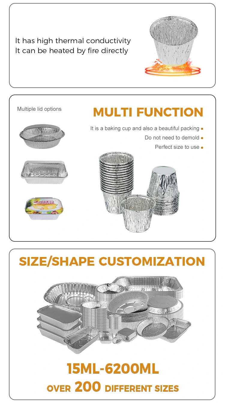 युनचु एल्युमिनियम पन्नी आपूर्तिकर्ता डिस्पोजेबल बेकिंग केक चाँदीको एल्युमिनियम पन्नी कन्टेनर फूड ग्रेड एल्युमिनियम पन्नी सामग्री, ठूलो मात्रामा उत्पादनको स्थिरता सुनिश्चित गर्न मोटो सामग्री चुहावट प्रतिरोधी र कम्प्रेसिभ छ। गर्मी प्रवाह समान र छिटो छ, बेकिंग समय छोटो पार्छ र खाना वितरण दक्षता सुधार गर्दछ। एकीकृत बेकिंग र प्याकलोडिंग स्टेप कम गर्न र प्याकलोड डिजाइन र कम गर्न। श्रम लागत घटाउँछ। धेरै विशिष्टताहरू उपलब्ध छन्, विभिन्न साना डेसर्टहरूको उत्पादनको लागि उपयुक्त छन्, र टेकआउट यातायातको समयमा सजिलै विकृत हुँदैनन्, ब्रान्ड प्रतिष्ठा बढाउन मद्दत गर्दछ।