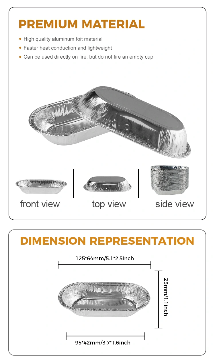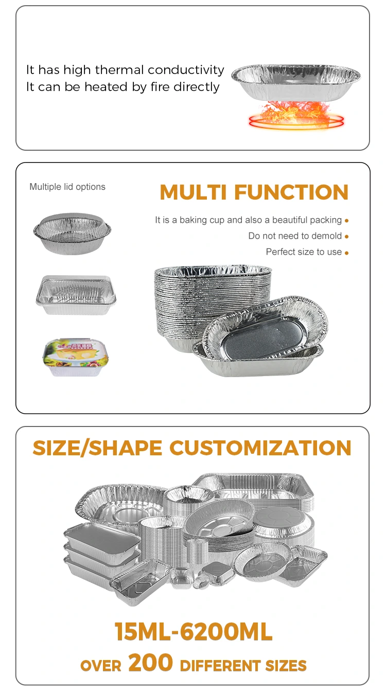 अंडाकार भुईन चाँदी एल्युमिनम पन्नीले कन्टेनर 6005 क्याटर, टेकवे डेलिभरी प्लेटफर्म, बफुटा, चकलेटहरू, सफ्टहरू र अन्य अवसरहरूको लागि उपयुक्त छ। कि यो बिभिन्न प्रकारका सॉस वा बेक्ड डिस्थर्जको लागि गार्निशको साथ जोडी, यो कम्प्याक्ट फोल बक्स तपाईंको डिशमा एक ठूलो थप छ। हल्का वजन र टिकाऊ, कन्टेनर उच्च-गुणवत्ता एल्युमिनियम पन्नीले बनेको छ र खाडलमा बेगैको पाल्किंगबाट बिग्रेको छ र स्टार्ट र प्रयोग गर्न सजिलो बनाउँदछ।