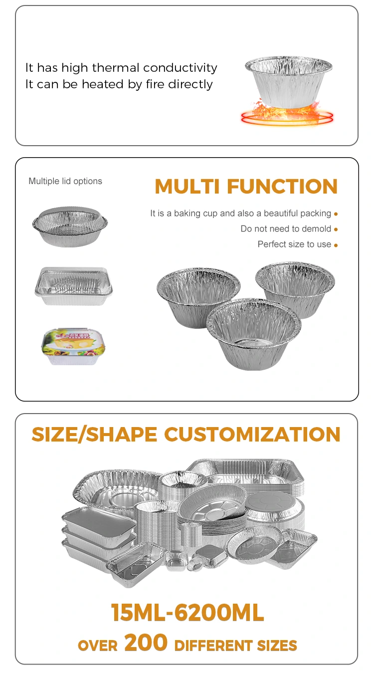 सुविधाहरू: राउन्ड बेक स्टोन चाँदी एल्युमिनम पन्नीले कन्टेनर स्वस्थ र वातावरणीय मैत्री हो, समग्र ज्वालामुखी बनाउनको लागि, खाद्य पदार्थ बनाउनका लागि पनि एक सफा गर्न आवश्यक छ।